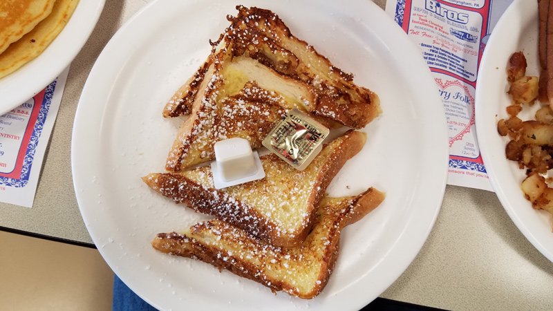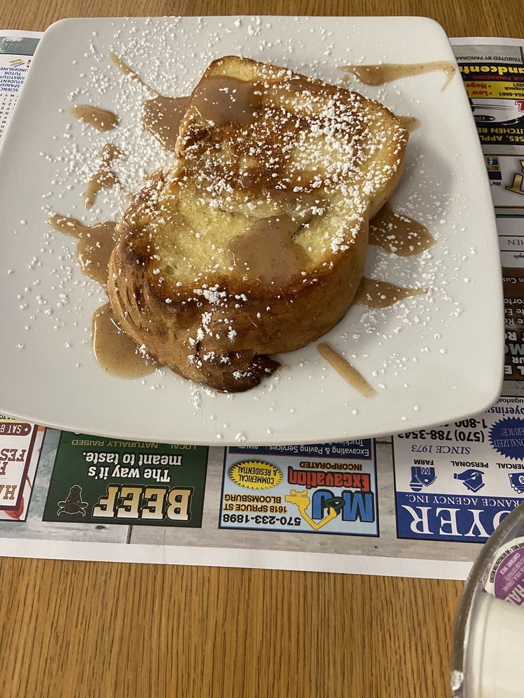 Thick slice of cinnamon bread grilled and covered with a sweet cinnamon glaze. Add bacon, ham. sausage, bologna or scrapple for an additional charge.