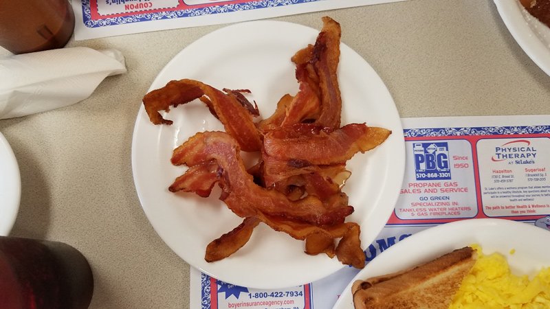 3 slices of raisin bread, dipped in our homemade French toast mix with choice of bacon, ham, sausage links or patties, bologna, or scrapple.