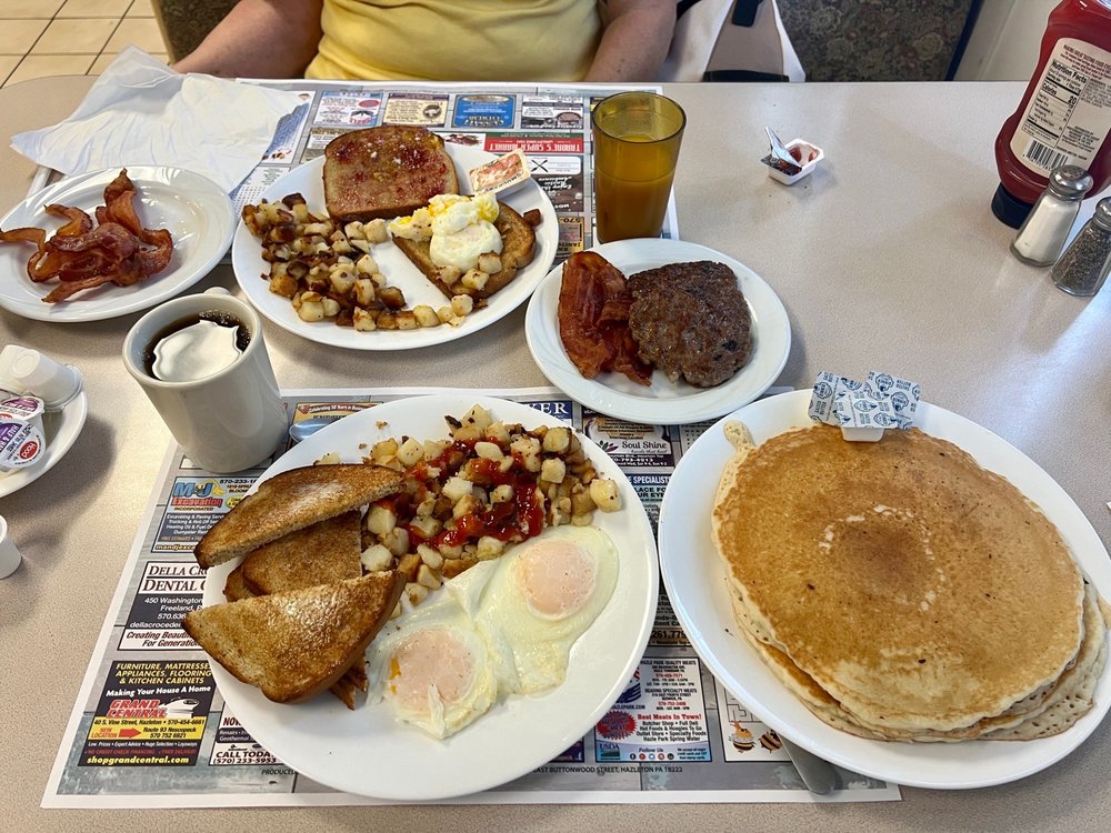2 fresh eggs, 2 big buttermilk pancakes or French toast, home fries, a rashor of bacon, 2 sausage links or patties, buttered toast and jelly.